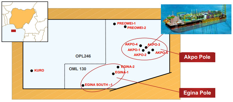 The OML 130 block is located 150 kilometers offshore Nigeria and includes four fields, Akpo, Egina, Egina South and Preowei.